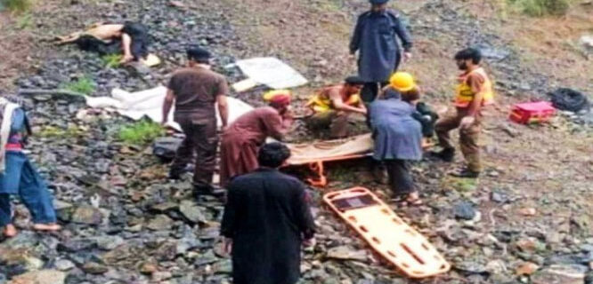 جھنگ(قوم انٹرنیشنل)جھنگ کے نواحی شہر شاہ جیونہ سے تعلق رکھنے والے باراتیوں کی بس کو کلرکہا انٹرچینج کے قریب سالٹ رینج پر المناک حادثہ پیش آگیا جس کے باعث14افراد جاں بحق جبکہ 60سے زائد زخمی ہوگئے ۔ تفصیلات کے مطابق اسلام آباد سے لاہورجانیوالی باراتیوں کی بس کی بریک سالٹ رینج کے قریب فیل ہوگئی جس کے باعث بس بے قابو ہو کر الٹ گئی ، جس کے بعد مخالف سمت سے آنیوالی دو کاریں بھی بس سے ٹکرا گئیں، حادثے میں 3خواتین سمیت14افراد جاں بحق جبکہ 60سے زائد زخمی ہوگئے ۔ ڈپٹی کمشنر چکوال کاکہنا ہے کہ حادثے کے فوری بعد موٹر وے پولیس اور امدادی ٹیمیں موقع پر پہنچیں اور زخمیوں کو ٹروما سنٹر چکوال اور ٹی ایچ کیو منتقل کیا ۔ ان کا کہنا تھا کہ حادثے کے بعد بس مکمل طور پر تباہ ہوگئی جس کی وجہ سے بس کی باڈی کو کاٹ کر زخمیوں کو باہر نکالاگیا ۔ بتایا جاتا ہے کہ جاں بحق ہونیوالے 12 افراد کا تعلق ایک ہی خاندان سے ہے اور وہ جھنگ کے نواحی علاقے شاہ جیونہ کے رہائشی ہیں۔