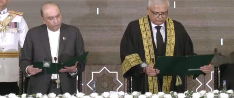 ایوان صدر اسلام آباد میں ہونے والی حلف برداری تقریب میں صدر مملکت آصف علی زرداری نے وفاقی آئینی عدالت کے پہلے چیف جسٹس امین الدین خان سے ان کے عہدے کا حلف لیا۔