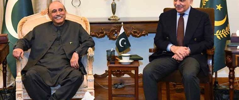 وزیراعظم شہباز شریف نے ایوان صدر اسلام آباد میں صدر مملکت آصف علی زرداری سے ملاقات کی، نائب وزیراعظم و وزیر خارجہ اسحاق ڈار، وزیر داخلہ محسن نقوی اور وزیر قانون اعظم نذیر تارڑ بھی ان کے ساتھ ہیں۔